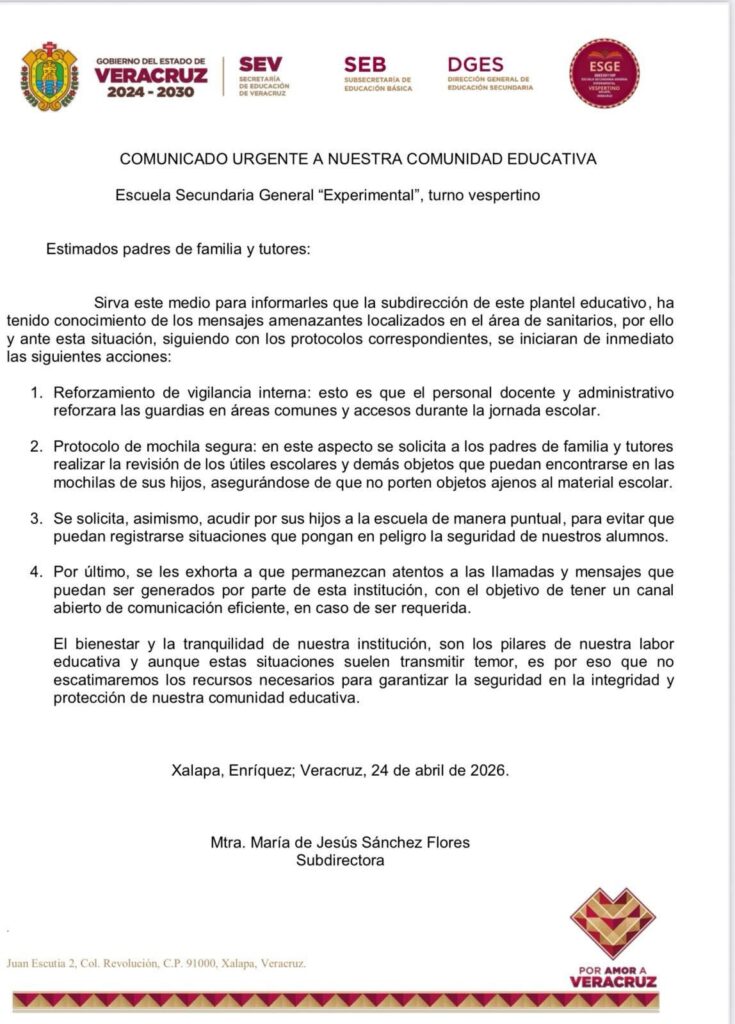 24-abril-2026.- La aparición de mensajes con contenido amenazante en los baños de la Escuela Secundaria General “Experimental”, turno vespertino, lo que derivó en la activación inmediata de protocolos de seguridad por parte de las autoridades del plantel.