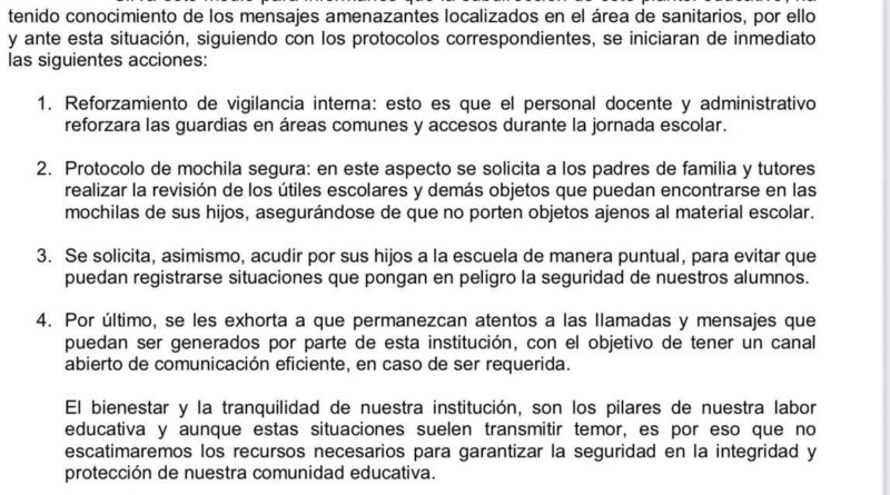 En respuesta, la escuela informó que se implementaron diversas medidas, entre ellas el reforzamiento de la vigilancia interna con mayor presencia de personal en accesos y áreas comunes, así como la aplicación del protocolo de “mochila segura”, solicitando a los padres revisar los útiles y pertenencias de sus hijos.