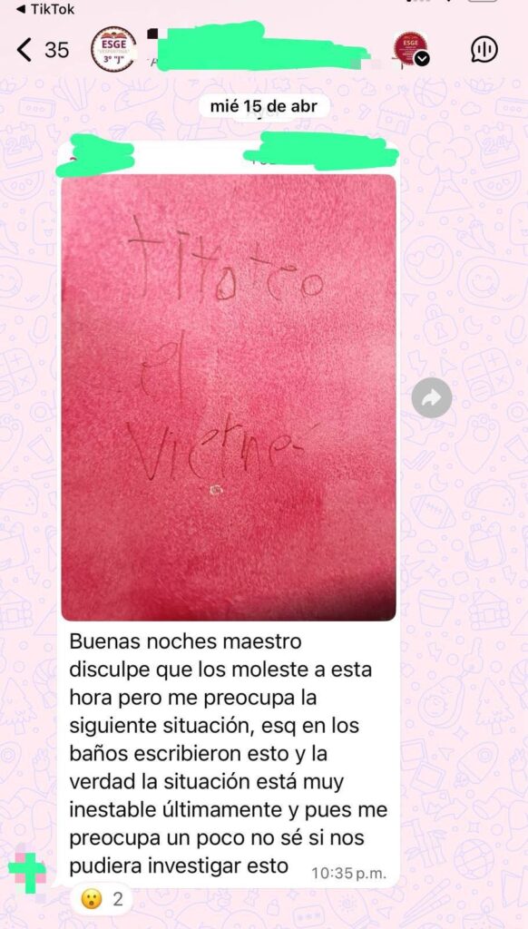 Cabe destacar que, según testimonios compartidos en redes y grupos escolares, este tipo de mensajes continúan apareciendo en las instalaciones, lo que ha incrementado la inquietud entre la comunidad, quienes piden una investigación más profunda para dar con los responsables y evitar que la situación escale.