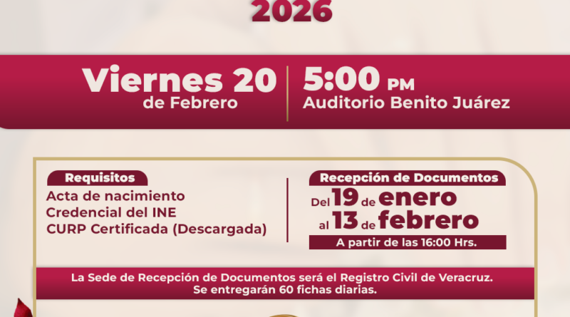 Del 19 de enero al 13 de febrero, el H. Ayuntamiento de Veracruz, a través del DIF Municipal, abre la inscripción para participar en las Bodas Colectivas 2026 “Por amor a la familia”, un evento gratuito que permite a cada pareja formalizar legalmente su unión, garantizar sus derechos y obligaciones legales y celebrar su compromiso familiar ante la sociedad.