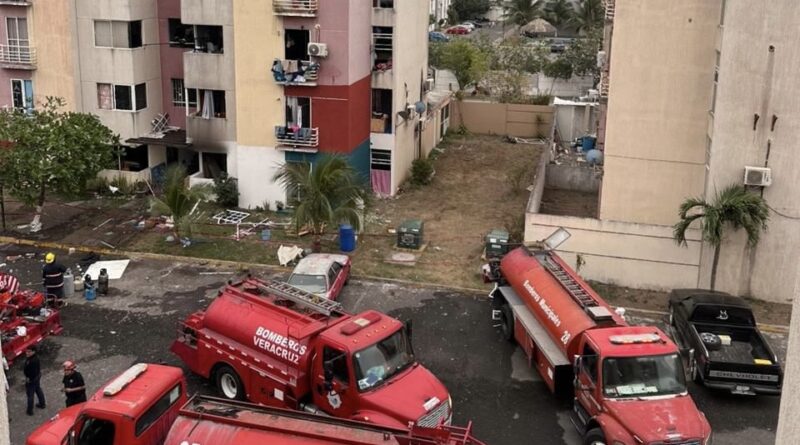 Elementos del Heroico Cuerpo de Bomberos y de Protección Civil municipal de Veracruz realizan labores de enfriamiento en un edificio de departamentos del fraccionamiento Rincón de Palma Real, luego del incendio provocado por una explosión al interior de una de las viviendas, que se extendió al resto del inmueble y fue controlado tras la pronta intervención de las corporaciones.