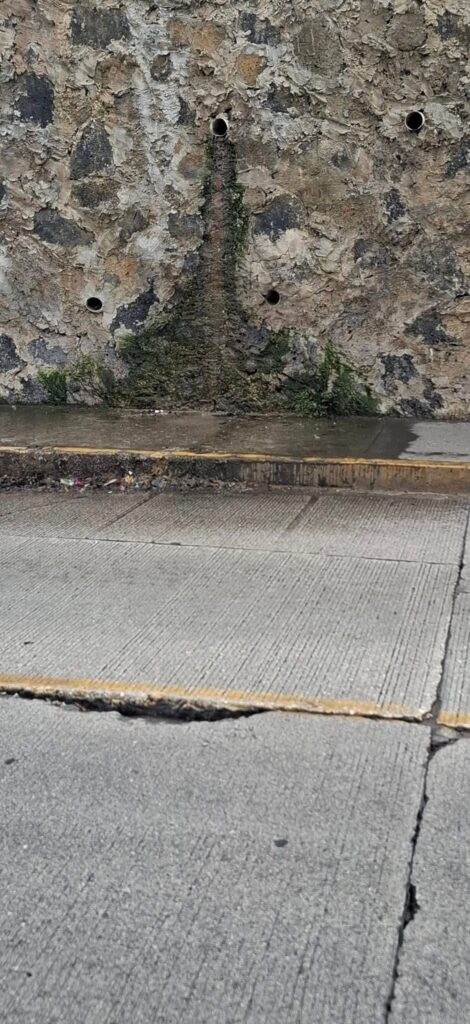 De acuerdo con el reporte ciudadano, los bajantes de los departamentos fueron dirigidos directamente hacia la calle, provocando que de manera constante escurran aguas negras con residuos de comida y excremento, lo que genera encharcamientos, malos olores y un foco de infección permanente.