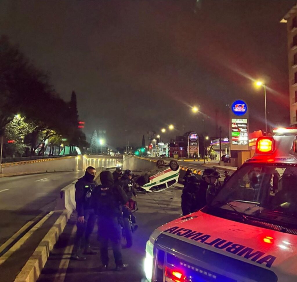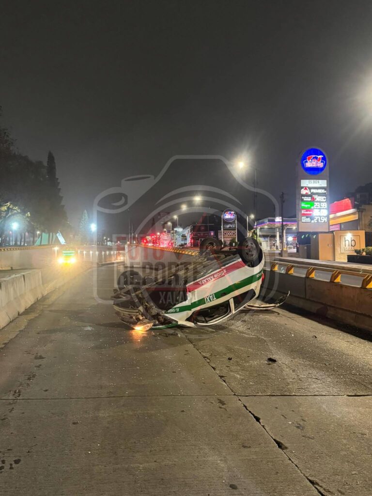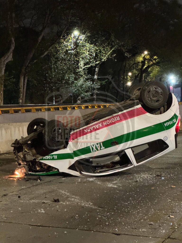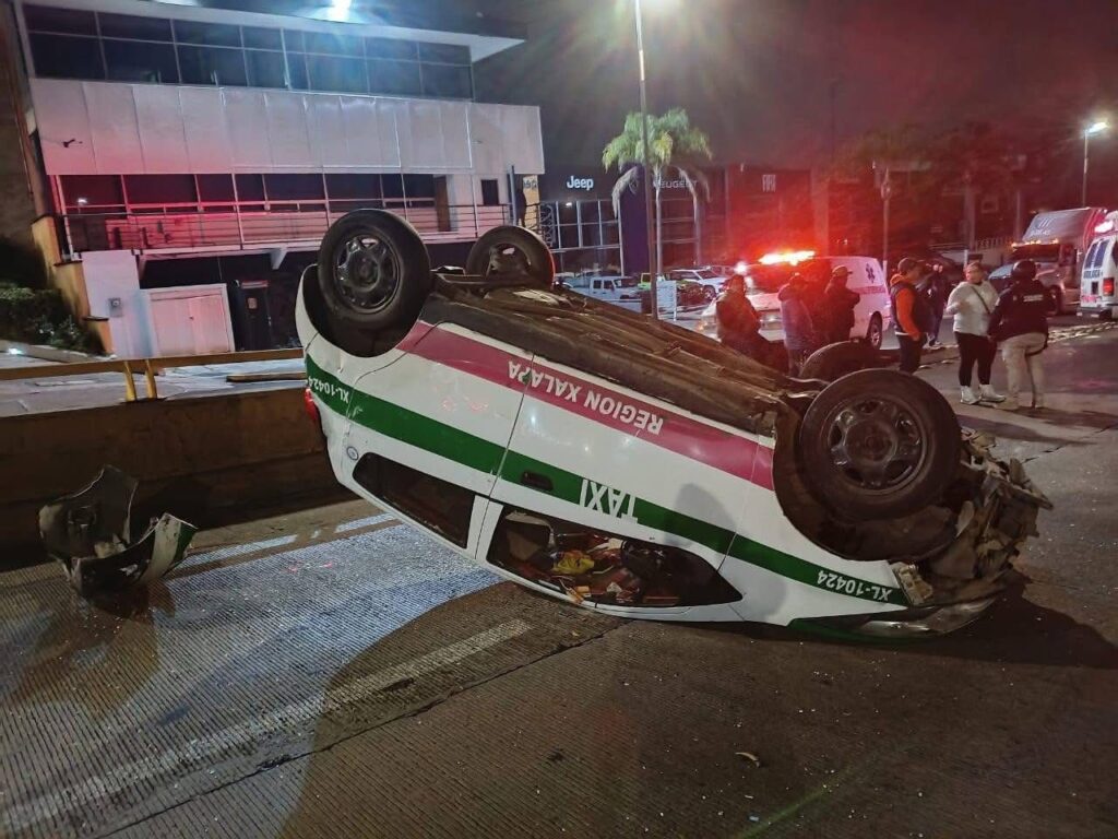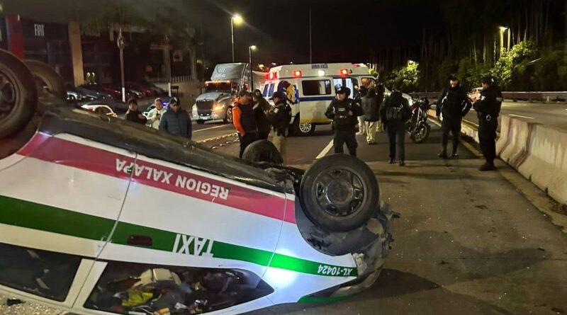 Xalapa., 19-enero-2026.-El exceso de alcohol y la falta de pericia cobraron factura la madrugada de este lunes. Un taxi terminó con las llantas hacia arriba a la altura del distribuidor vial Araucarias, dejando un saldo de dos personas heridas.