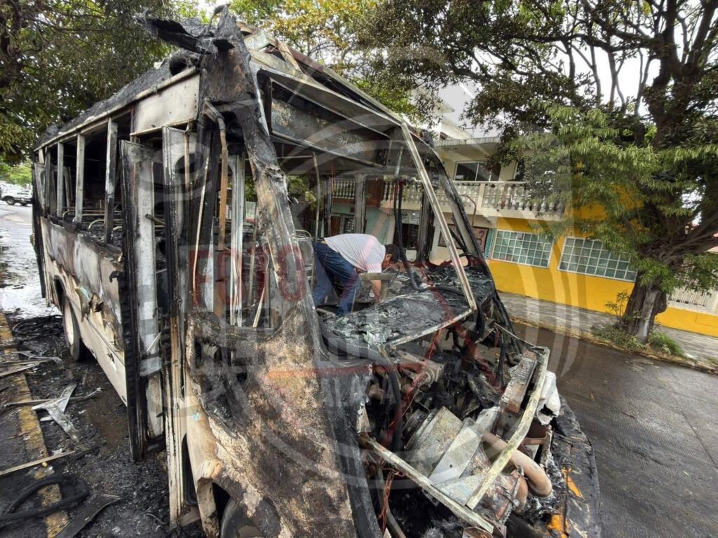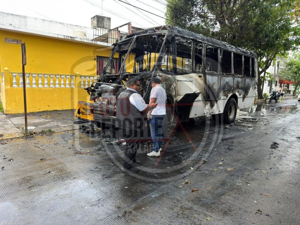 7-abril-2026.-Un fuerte incendio consumió una unidad del transporte público la mañana de este martes, en el cruce de 20 de Noviembre y Américas, en el fraccionamiento Virginia, en Veracruz.