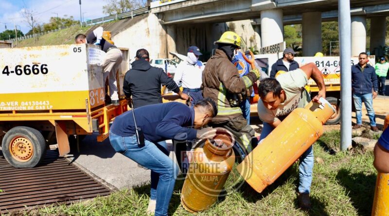 Xalapa, Ver. 03 de febrero 2026.- La mañana de este martes se registró un accidente vehicular debajo del puente de la Central de Abastos cuando se dio el encontronazo entre una camioneta Ford color verde y una unidad repartidora de gas de la empresa «Mas Gas» generando afectaciones en ambas unidades.