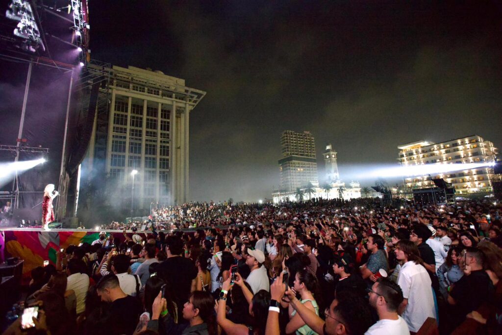 Por la noche, la macroplaza fue escenario del concierto masivo de Mon Laferte, quien emocionó a la gente con temas como “Tu falta de querer” y “Veracruz”, canción que hace referencia a su paso por tierras jarochas.