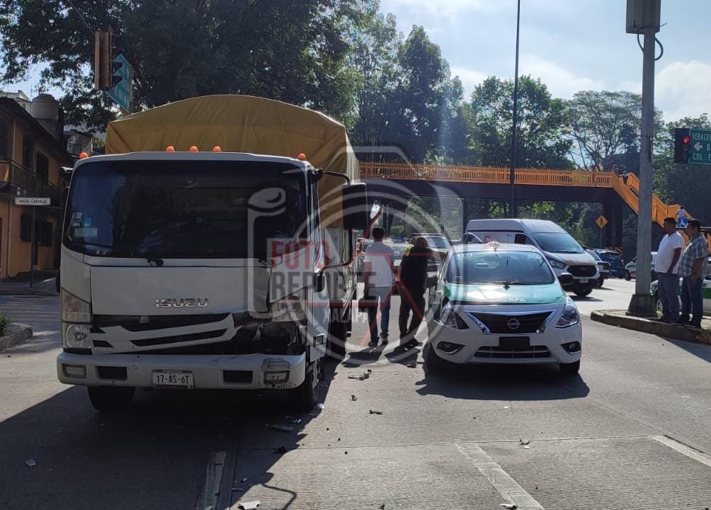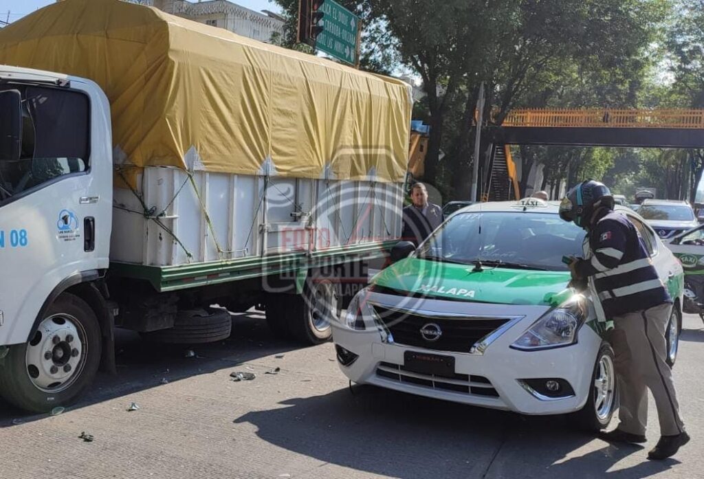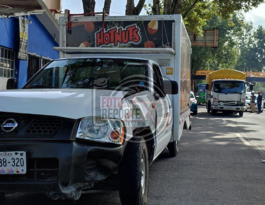 Xalapa, Ver., 28 de abril de 2026.- La mañana de este martes se registró un accidente vial en el cruce de Circuito Presidentes y Ángel Carvajal, donde se vieron involucradas tres unidades: un vehículo de alquiler con número económico Xl 1171, un camión de carga de la empresa Posta y una camioneta Nissan repartidora de la empresa Barcel.