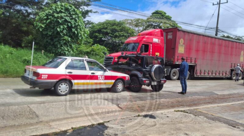 Choque entre taxi y camioneta deja solo daños materiales en la carretera Trancas–Coatepec