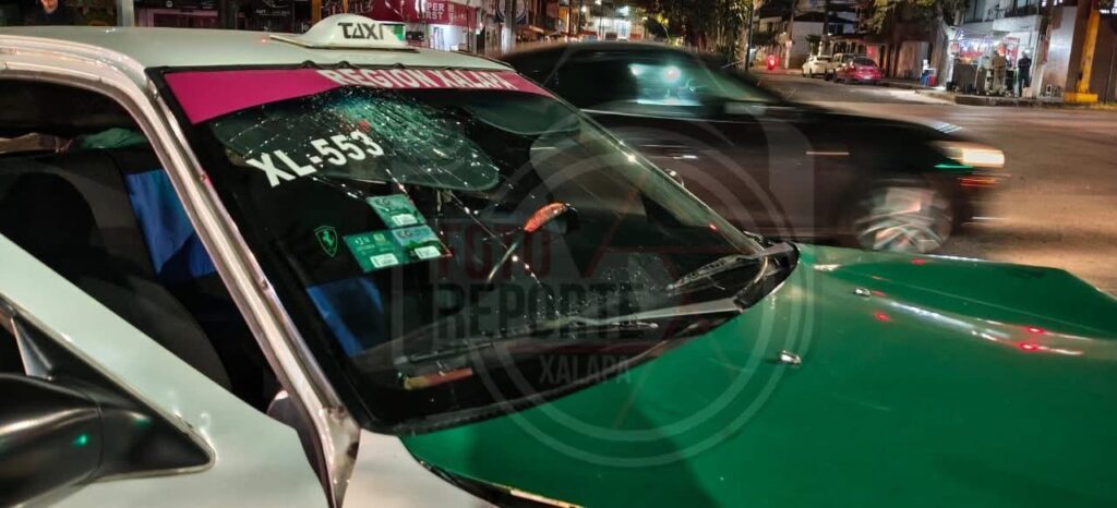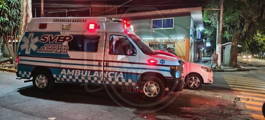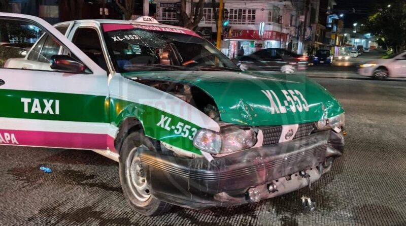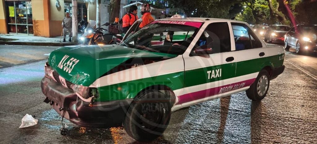 9-enero-2026.-Un aparatoso accidente vehicular se registró la noche de este viernes en el cruce de la calle Acueducto y Ruiz Cortines con dirección a la avenida Xalapa, tras la colisión entre un taxi y un automóvil particular, lo que dejó como saldo tres personas lesionadas.