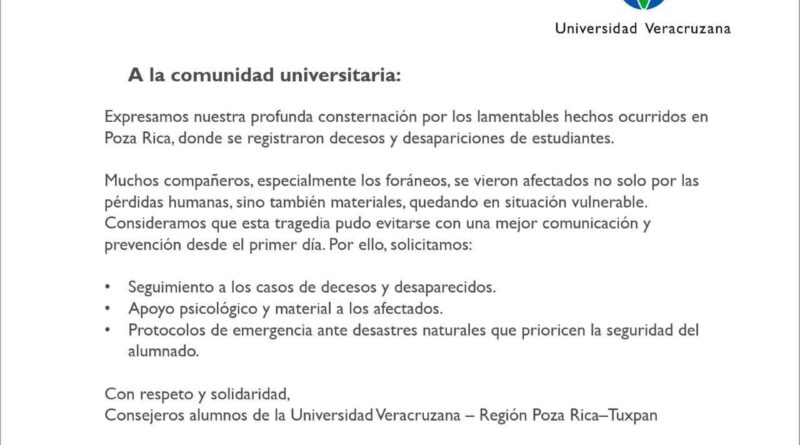 En el documento, los representantes estudiantiles exigieron que se brinde seguimiento y apoyo a los compañeros que sufrieron pérdidas humanas y materiales, tanto a quienes son originarios de otras regiones y estudian en Poza Rica, como a los que residen en la ciudad.
