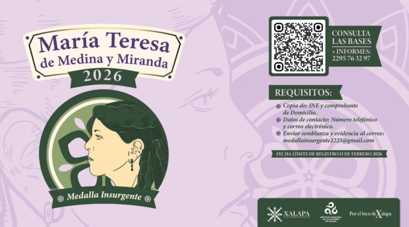 Xalapa, Ver., 19 de enero de 2026.- Con el fin de reconocer la trayectoria y trabajo en favor de la igualdad de género, la promoción y la defensa de los derechos de las mujeres, el Ayuntamiento, a través del Instituto Municipal de las Mujeres de Xalapa (IMMX), invita a la ciudadanía a participar en la convocatoria de la medalla insurgente “María Teresa de Medina y Miranda 2026”.