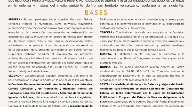 Xalapa, Ver., 13 de abril de 2026.- Con la finalidad de iniciar el procedimiento para elegir a la persona física o moral que haya contribuido con sus acciones a favor del medio ambiente, la Comisión Permanente de Medio Ambiente, Recursos Naturales, Cambio Climático y de Protección y Bienestar Animal de la LXVII Legislatura aprobó y emitió la convocatoria para el otorgamiento de la Medalla al Mérito por la Defensa y Mejora del Medio Ambiente 2026, distinción que entrega anualmente el Congreso del Estado.