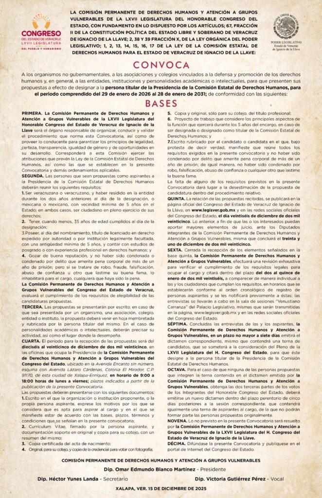 Xalapa, Ver., 16 de diciembre de 2025.- La Comisión Permanente de Derechos Humanos y Atención a Grupos Vulnerables de la LXVII Legislatura emitió la convocatoria pública para la designación de la persona titular de la Comisión Estatal de Derechos Humanos de Veracruz (CEDHV) para el periodo comprendido del 29 de enero de 2026 al 28 de enero de 2031.
