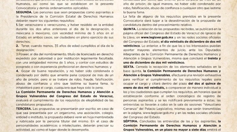 Xalapa, Ver., 16 de diciembre de 2025.- La Comisión Permanente de Derechos Humanos y Atención a Grupos Vulnerables de la LXVII Legislatura emitió la convocatoria pública para la designación de la persona titular de la Comisión Estatal de Derechos Humanos de Veracruz (CEDHV) para el periodo comprendido del 29 de enero de 2026 al 28 de enero de 2031.