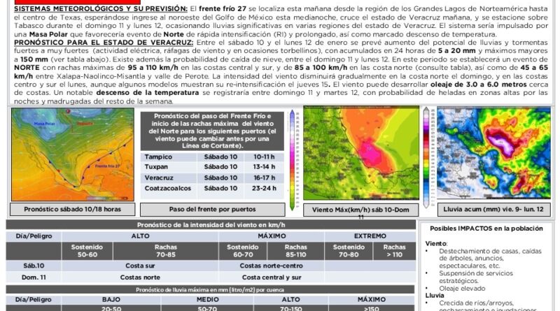 De acuerdo con el Sistema de Alerta Temprana de Veracruz (SIATVer), el Frente Frío 27 será impulsado por una masa de aire polar, lo que generará un Norte de rápida intensificación y de carácter prolongado, además de lluvias significativas, principalmente en la región de Los Tuxtlas y en la parte media y alta de las cuencas de los ríos Coatzacoalcos y Tonalá.
