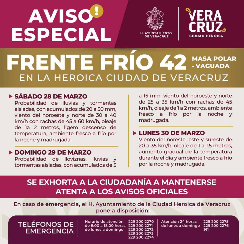 La dirección de Protección Civil Municipal de Veracruz de acuerdo al aviso especial por el ingreso del frente frío número 42, informa que se podrán presentar rachas de viento de 45 a 60 km por hora; con potencial de lluvias y ambiente fresco durante este fin de semana.