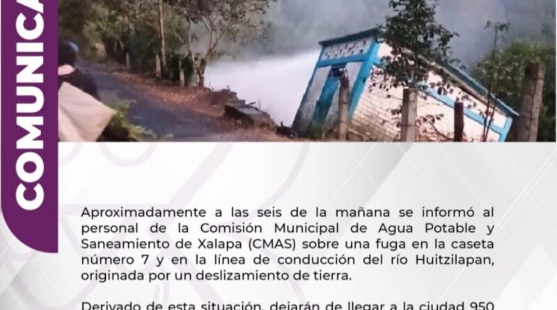 Xalapa., 18-noviembre-2025.-La mañana de este martes, alrededor de las 6:00 horas, personal de la Comisión Municipal de Agua Potable y Saneamiento de Xalapa (CMAS) fue notificado sobre una importante fuga registrada en la caseta número 7 y en la línea de conducción del río Huitzilapan, provocada por un deslizamiento de tierra.