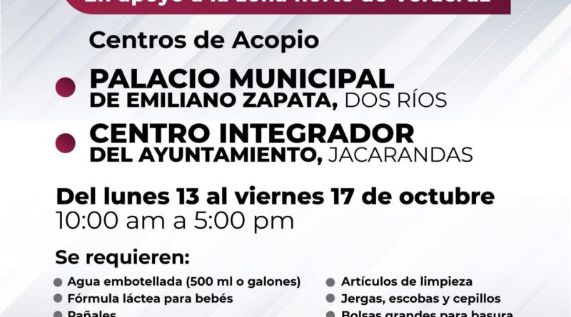 Emiliano Zapata, Ver.- Con el propósito de solidarizarse con las familias que resultaron afectadas por las recientes lluvias e inundaciones en la zona norte del estado, el Ayuntamiento de Emiliano Zapata anunció el inicio de una colecta solidaria que se llevará a cabo del lunes 13 al viernes 17 de octubre.