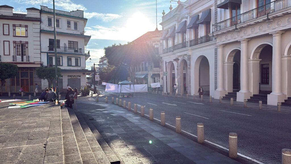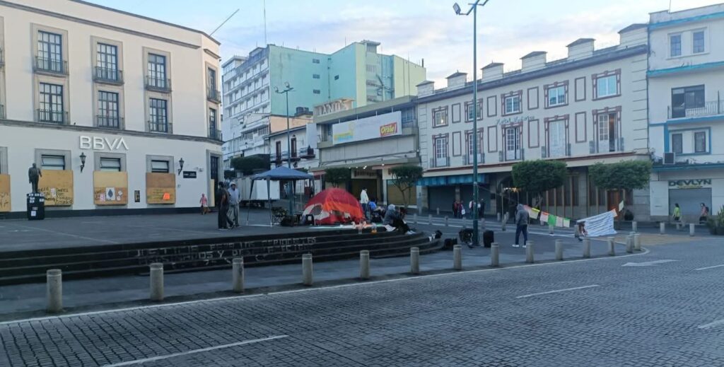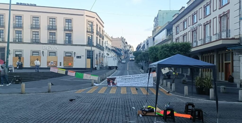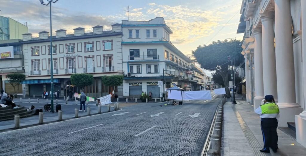 Xalapa, Ver., 3 de octubre de 2025.– La circulación en la calle Enríquez, en pleno centro de Xalapa, permanece cerrada desde hace más de 20 horas debido a la protesta de maestros jubilados pertenecientes a la Unión de Beneficiarios del Seguro de Vida Institucional de Veracruz (UBSIVER).