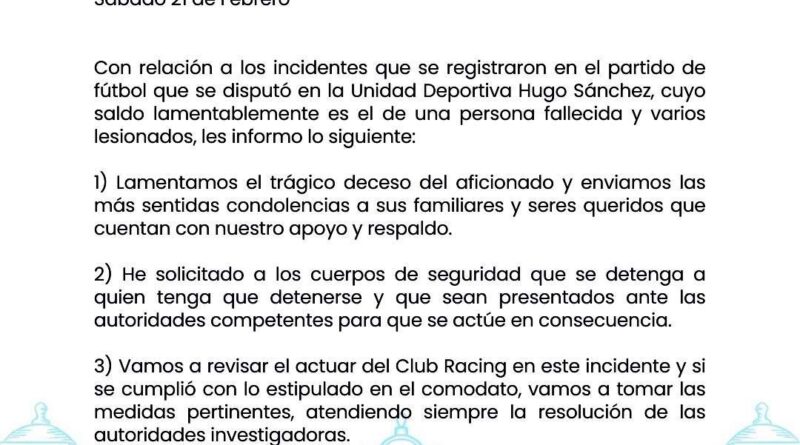 3) Vamos a revisar el actuar del Club Racing en este incidente y si se cumplió con lo estipulado en el comodato, vamos a tomar las medidas pertinentes, atendiendo siempre la resolución de las autoridades investigadoras.