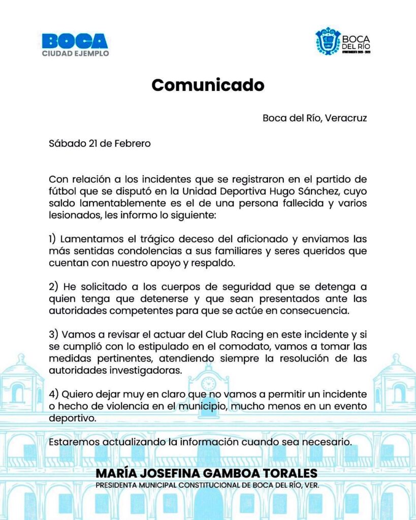 Boca del Río, Ver. 21 de febrero de 2026.- Con relación a los incidentes que se registraron en el partido de futbol que se disputó en la Unidad Deportiva Hugo Sánchez, cuyo saldo lamentablemente es el de una persona fallecida y varios lesionados, les informo lo siguiente: