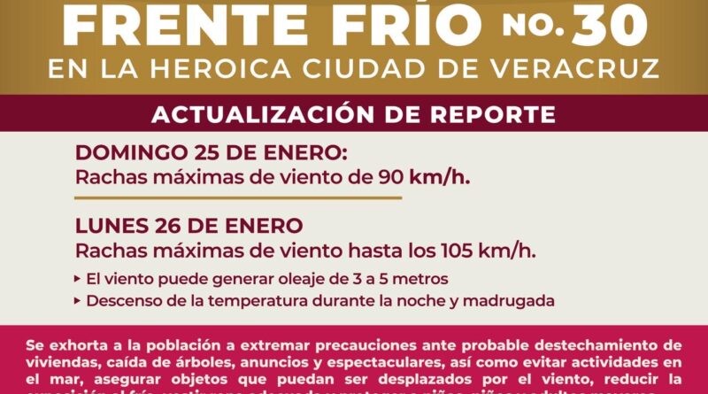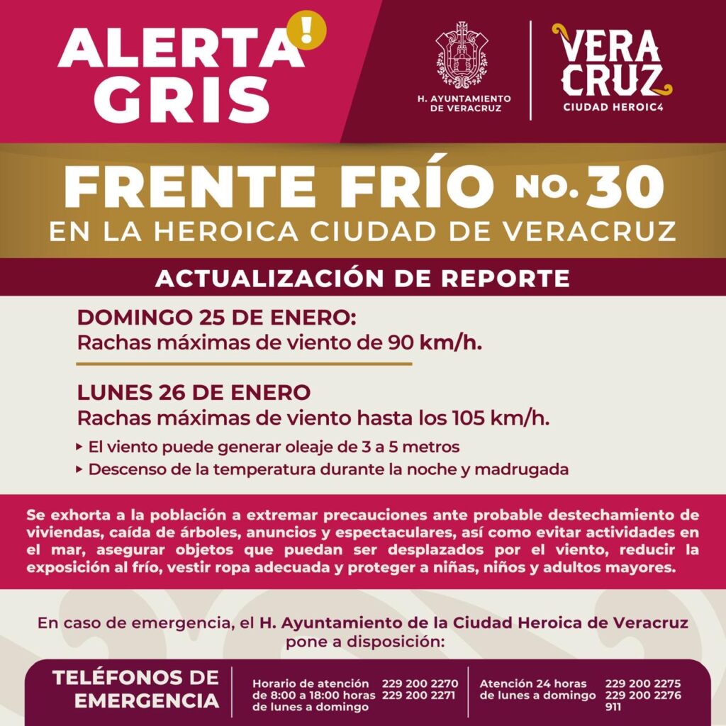 La dirección de Protección Civil municipal de Veracruz informa que se mantiene la Alerta Gris ante el ingreso del Frente Frío No. 30, que afectará la ciudad a partir de este domingo con viento del norte, oleaje elevado y descenso de temperatura.