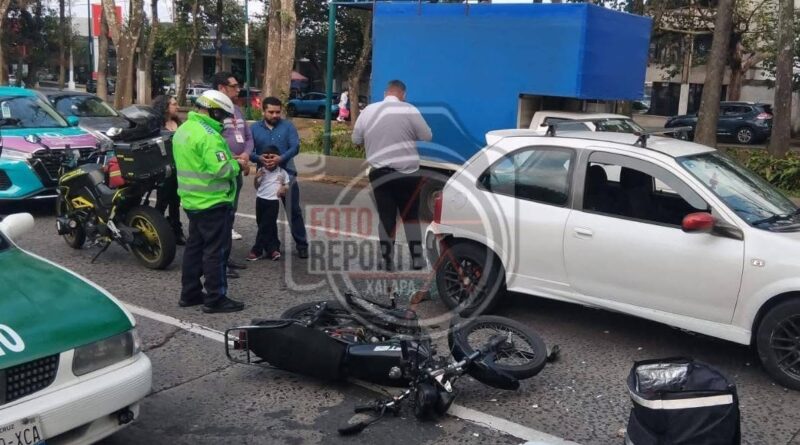 Xalapa, Ver., 10 de diciembre 2025.– Una joven motociclista resultó lesionada esta tarde tras chocar por alcance contra un vehículo tipo Chevy sobre avenida Xalapa, casi en la esquina con Esperanza Bringas, frente al panteón Xalapeño.