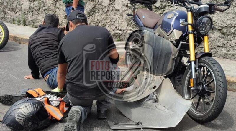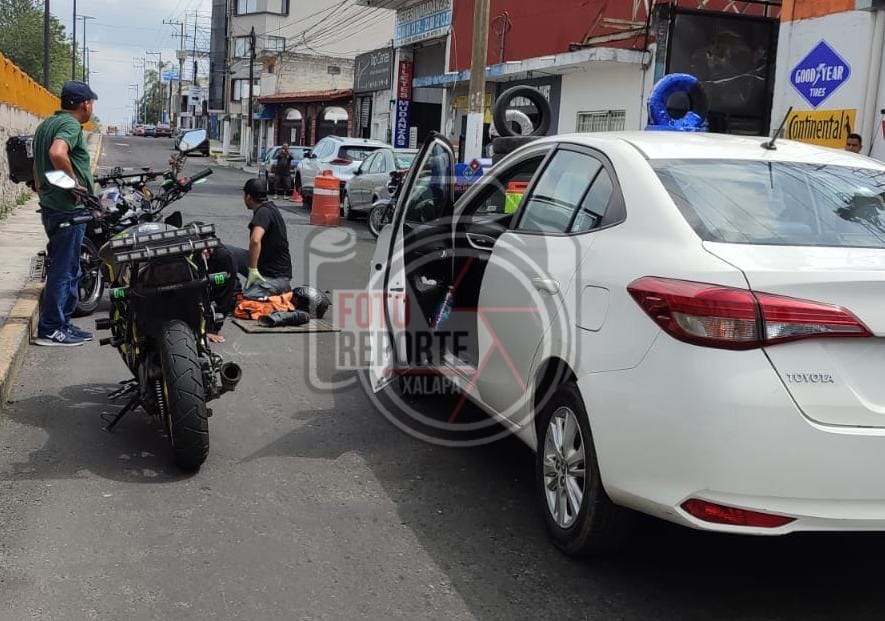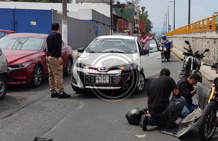 Xalapa, Ver., 17 de abril de 2026.- Un percance vial entre un automóvil particular de la marca Toyota, color blanco, y una motocicleta Vento se registró sobre la lateral del puente de Miguel Alemán, en el tramo entre la avenida Miguel Alemán y la calle Adolfo Ruiz Cortines.