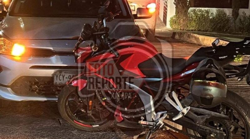 Xalapa, Ver. 04 de diciembre 2025.- Esta noche se registró un percance en la calle Soconusco, de la colonia Aguacatal, donde un motociclista terminó estrellándose contra un automóvil.