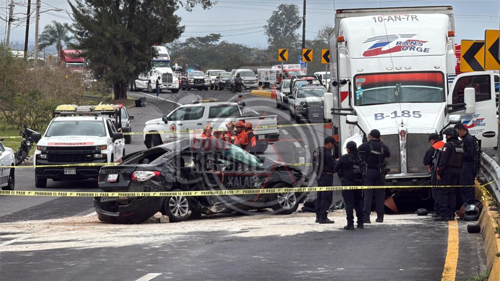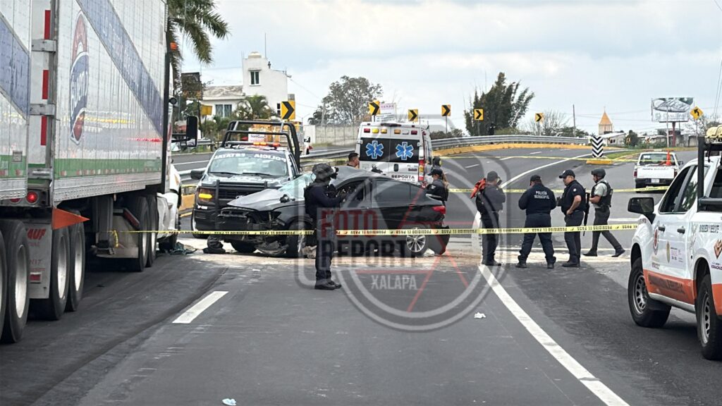 Xalapa, Ver., 24 de febrero2026.– Un trágico accidente se registró a la altura de la zona de Miradores, sobre la carretera Xalapa–Veracruz con dirección al puerto, donde un tráiler de doble remolque impactó a un vehículo particular, dejando como saldo una mujer fallecida y tres personas lesionadas.