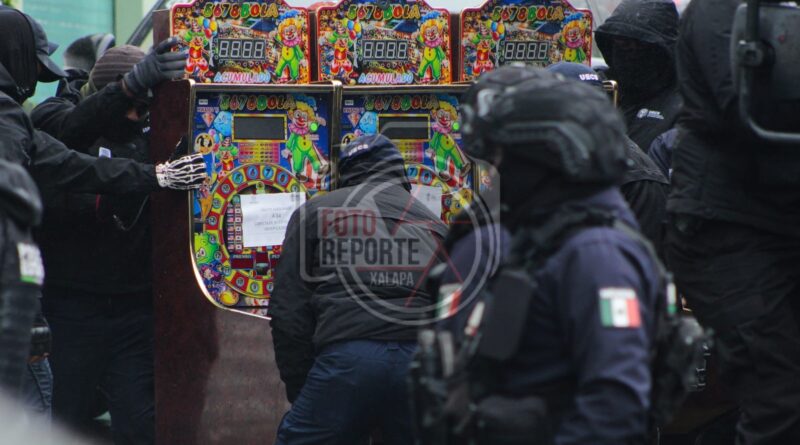 Xalapa, Ver. 02 de febrero 2026.- Elementos de la Unidad Especializada en Combate al Secuestro (UECS), en coordinación con personal de la Secretaría de la Defensa Nacional, Guardia Nacional y Policía Estatal, desplegaron un operativo durante la mañana de este lunes en distintos puntos de Xalapa, donde fueron retiradas y aseguradas máquinas tragamonedas, también conocidas como mini casinos.