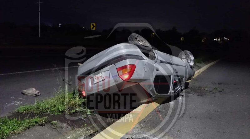 Emiliano Zapata., 07 de octubre de 2025.- La madrugada de este martes, una pareja que viajaba a bordo de un vehículo Ford con placas YHS-5856 sufrió una aparatosa volcadura sobre la carretera Xalapa–Veracruz, a la altura de la Academia de Policía.