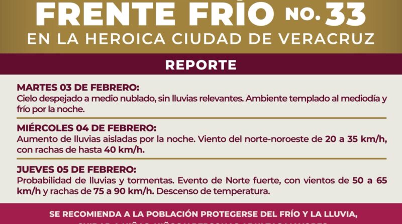 Veracruz, Ver.- La dirección de Protección Civil municipal de Veracruz emitió un Aviso Especial ante el pronóstico de ingreso del Frente Frío 33 en las primeras horas del jueves 5 de febrero, aumentando los nublados y potencial de lluvias y tormentas, así como un nuevo evento de norte con rachas máximas de 75 a 90 km/h y descenso de temperatura.