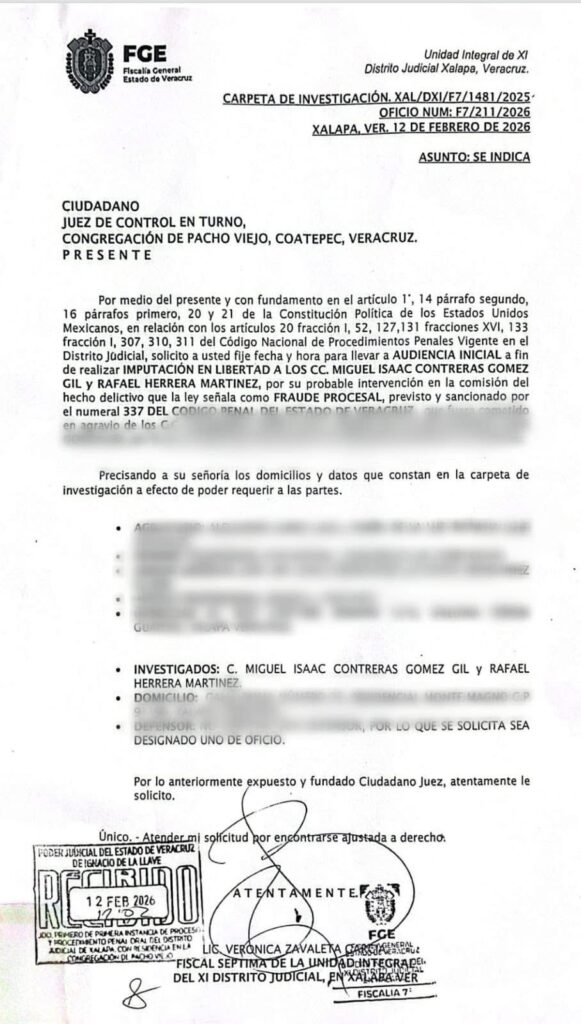 De acuerdo con información oficial, los imputados Miguel Isaac C. G. y Rafael H. M. enfrentan cargos por fraude procesal dentro del expediente XAL/DXI/F7/1481/2025, el cual fue turnado a la Unidad Integral del XI Distrito Judicial en Xalapa, luego de varios meses de gestiones legales.