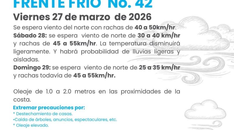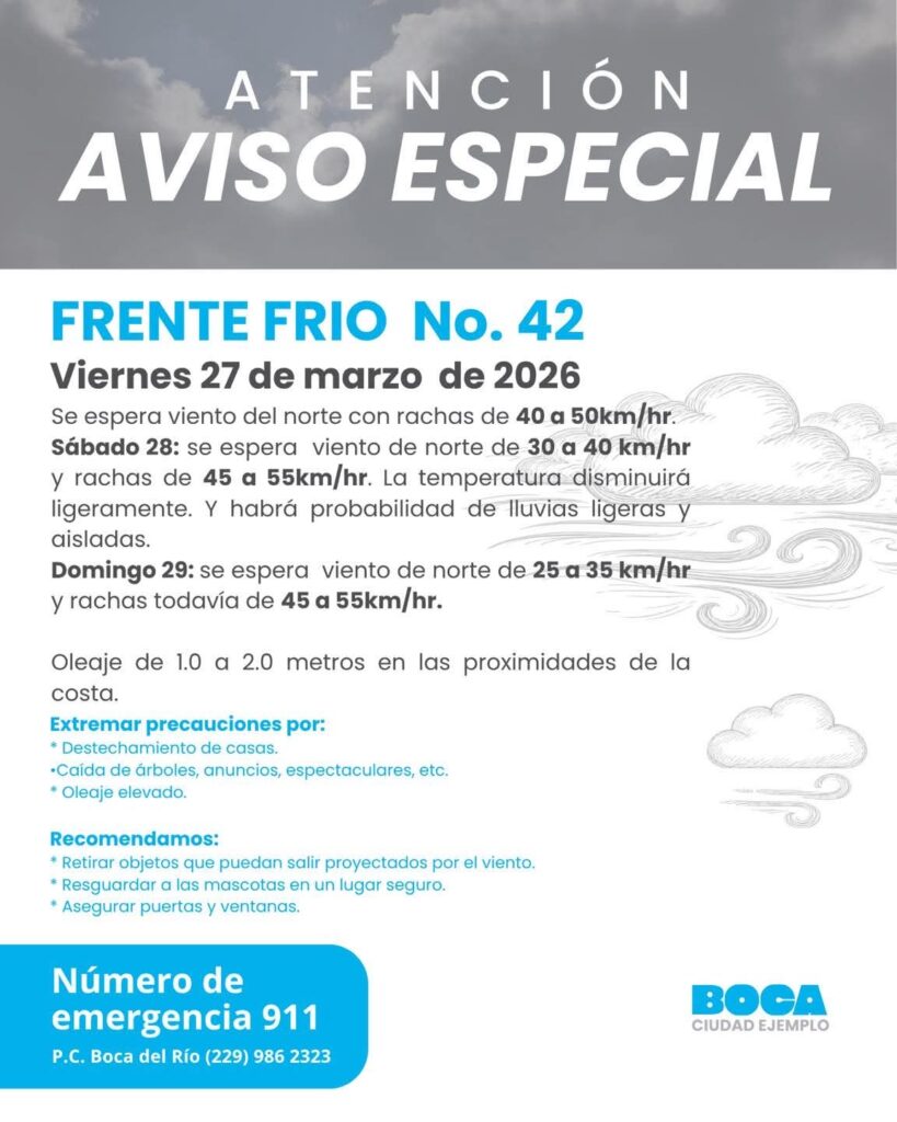 La Presidenta Municipal de Boca del Río, Maryjose Gamboa Torales, a través de la Dirección de Protección Civil Municipal de Boca del Río, comunica que el gobierno municipal se pone en alerta por los efectos que se puedan presentar ante el ingreso del frente frío número 42.