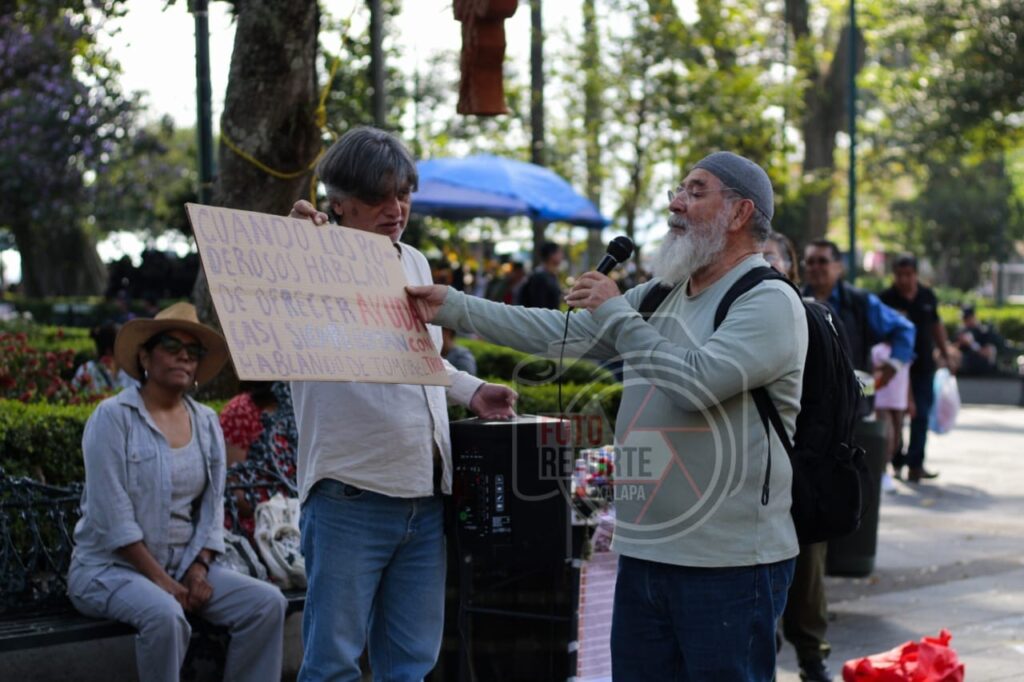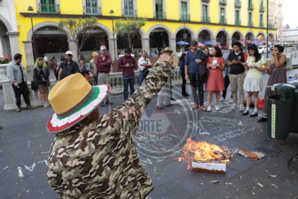 Xalapa., 10-enero-2026.- Mediante la quema simbólica de una piñata con la figura de Donald Trump, integrantes del Frente Xalapa x Palestina se manifestaron en la capital veracruzana para condenar las recientes acciones del gobierno de Estados Unidos en territorio venezolano.