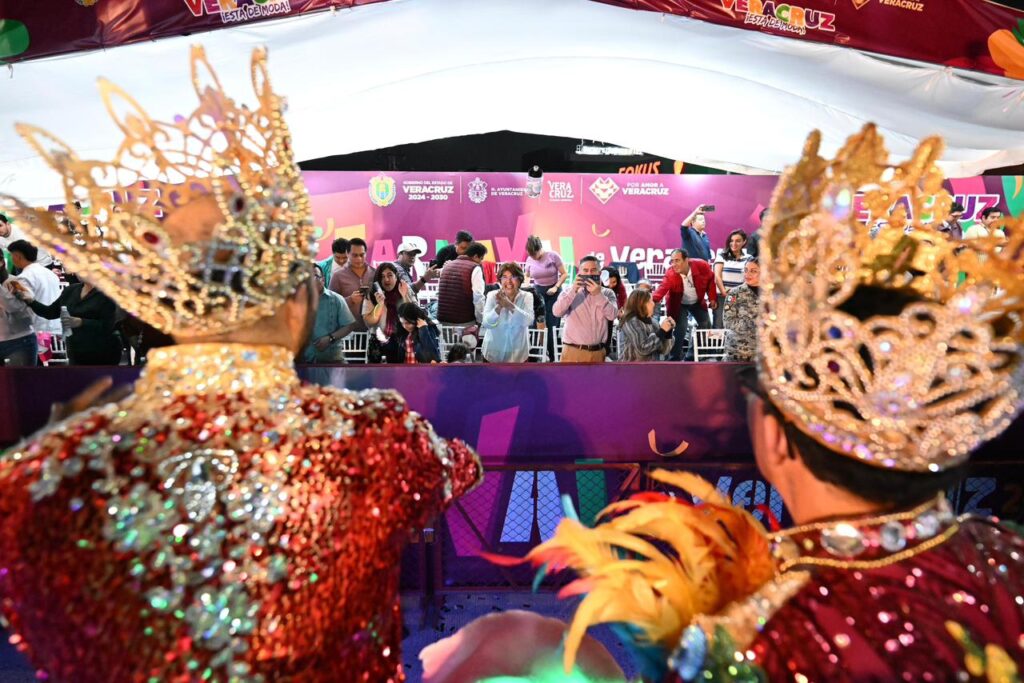 Durante el desfile, la Corte Real -encabezada por los Soberanos Fernanda I y Nayo I, así como los reyes infantiles Maryelli I y Gael I-, derrochó entusiasmo y glamour con sus impresionantes atuendos de gala carnestolenda, logrando, al paso de sus majestuosos carros alegóricos, animar a los asistentes y convertir el ambiente fresco en una noche de calidez jarocha.