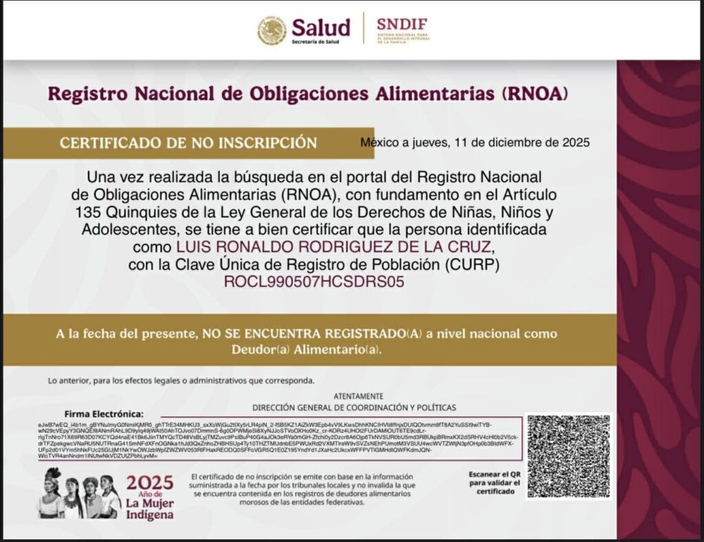 17 de diciembre de 2025.- Se hicieron públicos documentos oficiales relacionados con el luchador profesional de artes marciales mixtas Ronaldo Rodríguez, conocido como “Lazy Boy”, tras las acusaciones que se realizaron en su contra. Entre ellos, un certificado del Registro Nacional de Obligaciones Alimentarias (RNOA), emitido en diciembre de 2025, indica que el deportista no se encuentra registrado como deudor alimentario a nivel nacional. Además, resoluciones judiciales señalan que la pensión alimentaria fue fijada como medida provisional dentro de un procedimiento que aún sigue en curso.