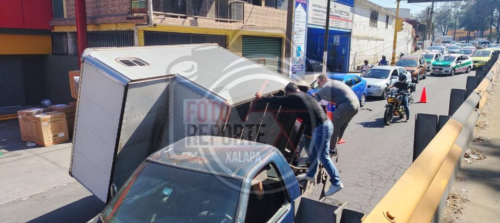 Un percance vial poco común se registró la tarde de este jueves sobre la lateral del puente Macuiltepetl, en la ciudad de Xalapa, donde la caja seca de una camioneta Ford Lobo, de modelo atrasado, terminó volcada a un costado de la unidad.