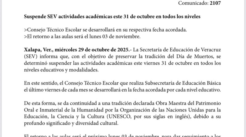 Xalapa, Ver., miércoles 29 de octubre de 2025.- La Secretaría de Educación de Veracruz (SEV) informa que, con el objetivo de preservar la tradición del Día de Muertos, se determinó suspender las actividades académicas este viernes 31 de octubre en todos los niveles educativos y modalidades.