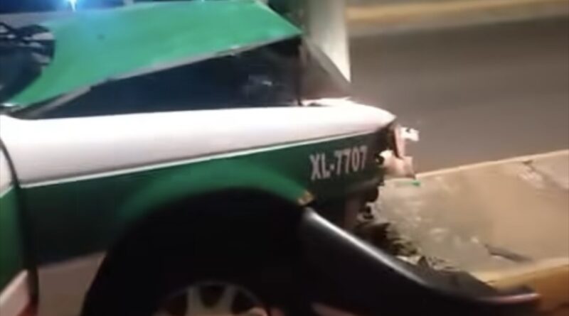 10-noviembre-2025.-La madrugada de este lunes, el taxi con número económico XL-7707 terminó montado sobre el camellón central tras impactarse contra una luminaria en la avenida Lázaro Cárdenas, a la altura del puente Macuiltépetl.