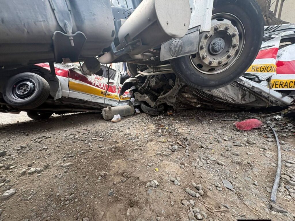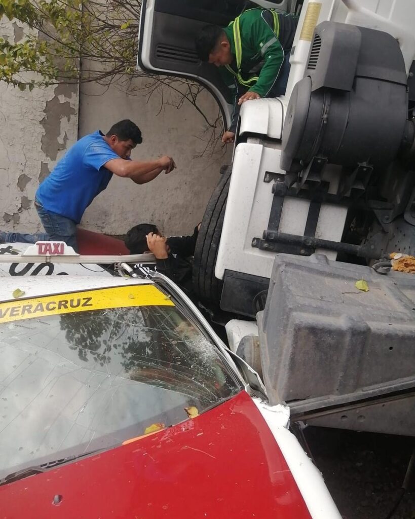 De acuerdo con los primeros reportes, el operador del tractocamión perdió el control de la pesada unidad, lo que ocasionó que se impactara contra varios vehículos particulares. Durante el percance, un taxi fue aplastado por el tráiler, quedando su conductor prensado entre la unidad de alquiler y las rueda de la pesada unidad.