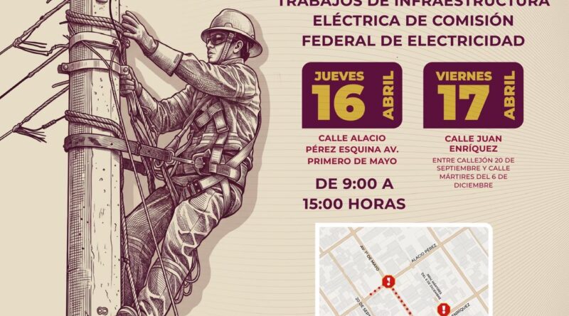 El Ayuntamiento de Veracruz informa que la Comisión Federal de Electricidad (CFE) realizará trabajos de infraestructura eléctrica los días jueves 16 y viernes 17 de abril, en un horario de 9:00 a 15:00 horas. Estas acciones forman parte de la creación de nuevas áreas del sector de baja tensión en la colonia Flores Magón.