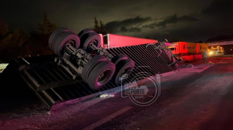 Tráiler cargado con azúcar vuelca en la Xalapa–Perote