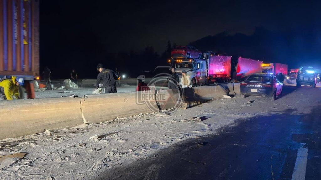 De acuerdo con el reporte preliminar, uno de los pesados vehículos, de color gris con placas 692LL1U1 y doble remolque cargado con azúcar, terminó volcado, quedando atravesado sobre la vialidad y obstruyendo ambos carriles. El conductor resultó lesionado y fue trasladado al IMSS por paramedicos del EMS
