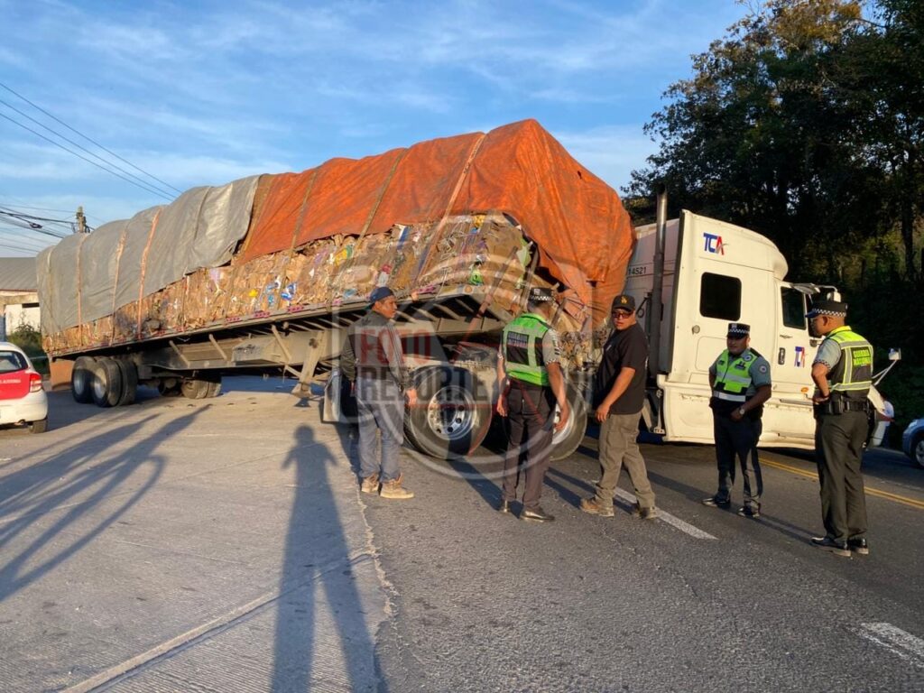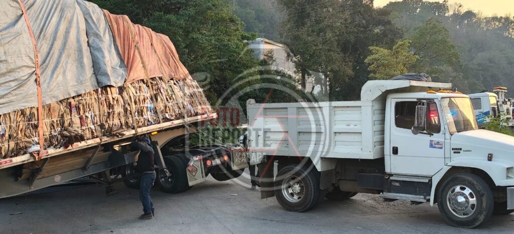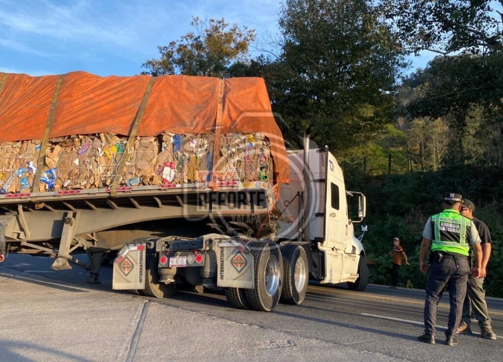 Xalapa, Ver. 09 de enero 2026.- Un tráiler cargado con cartón quedó atorado sobre la carretera Xalapa–Perote, a la altura de la colonia 3 de Mayo, luego de que el operador intentara retornar con dirección a Xalapa y el desnivel de la vía le impidiera completar la maniobra.
