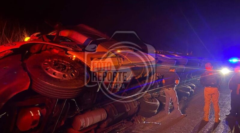 Xalapa, Ver. 22 de noviembre 2025.- Esta noche, un tráiler que circulaba con dirección a esta capital volcó sobre la carretera Xalapa – Veracruz, a la altura del 63 Batallón, luego de que el operador perdiera el control de la pesada unidad.
