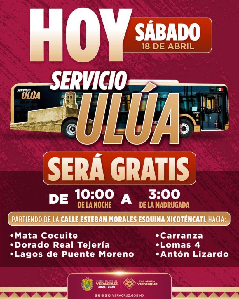 Veracruz, Ver., sábado 18 de abril de 2026.– El Gobierno del Estado informa que, en el marco del Festival Puerto Sonoro Veracruz, brindará el servicio de Transporte Ulúa gratuito para facilitar el regreso seguro de las y los asistentes.