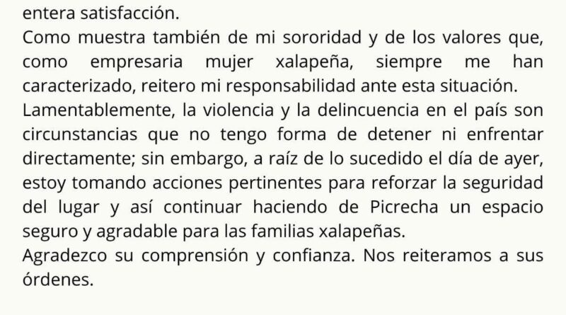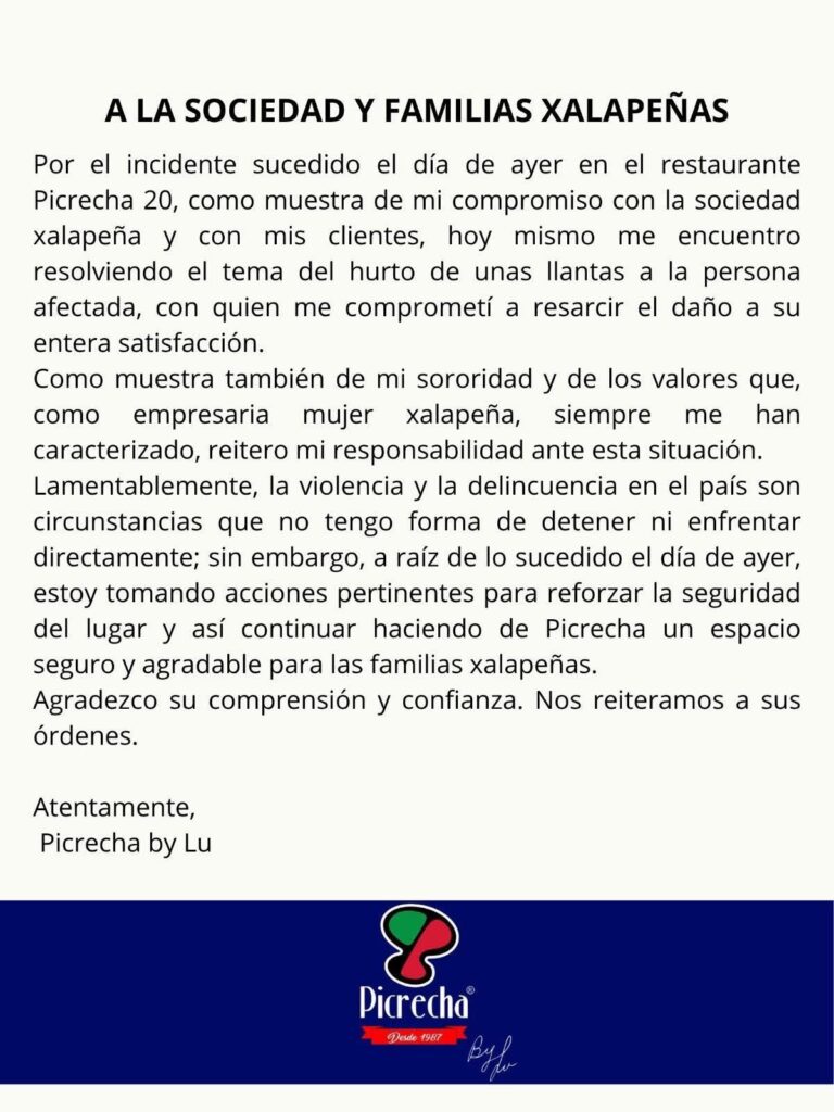 Xalapa, Ver., 31 de marzo de 2026.– Luego del incidente registrado en el estacionamiento del restaurante Picrecha, donde un cliente fue víctima del robo de llantas de su vehículo, el establecimiento informó que ya fue cubierto en su totalidad el monto correspondiente por los daños ocasionados.