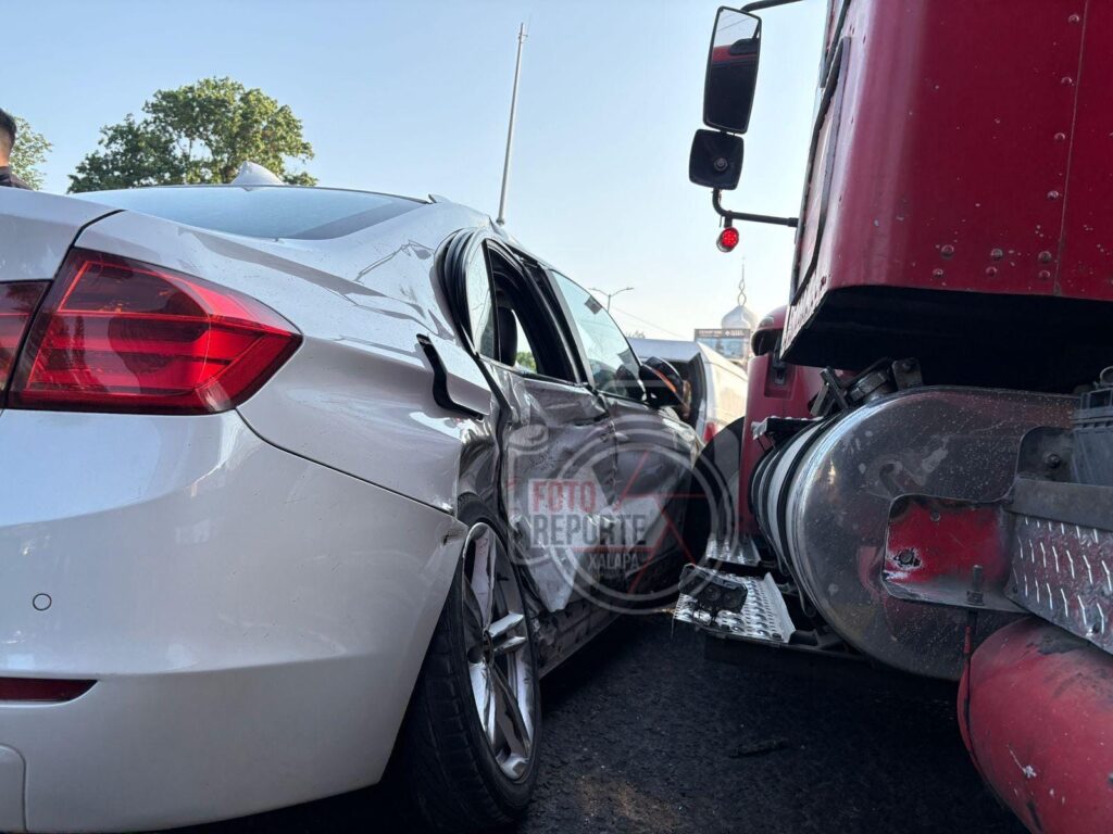 De acuerdo con versiones recabadas en el lugar, la unidad pesada, presuntamente habría sufrido una falla mecánica en el sistema de frenos, lo que derivó en la colisión contra el costado del automóvil. Además, también resultó afectado un tercer vehículo, un honda color gris, el cual presentó daños en la parte trasera.